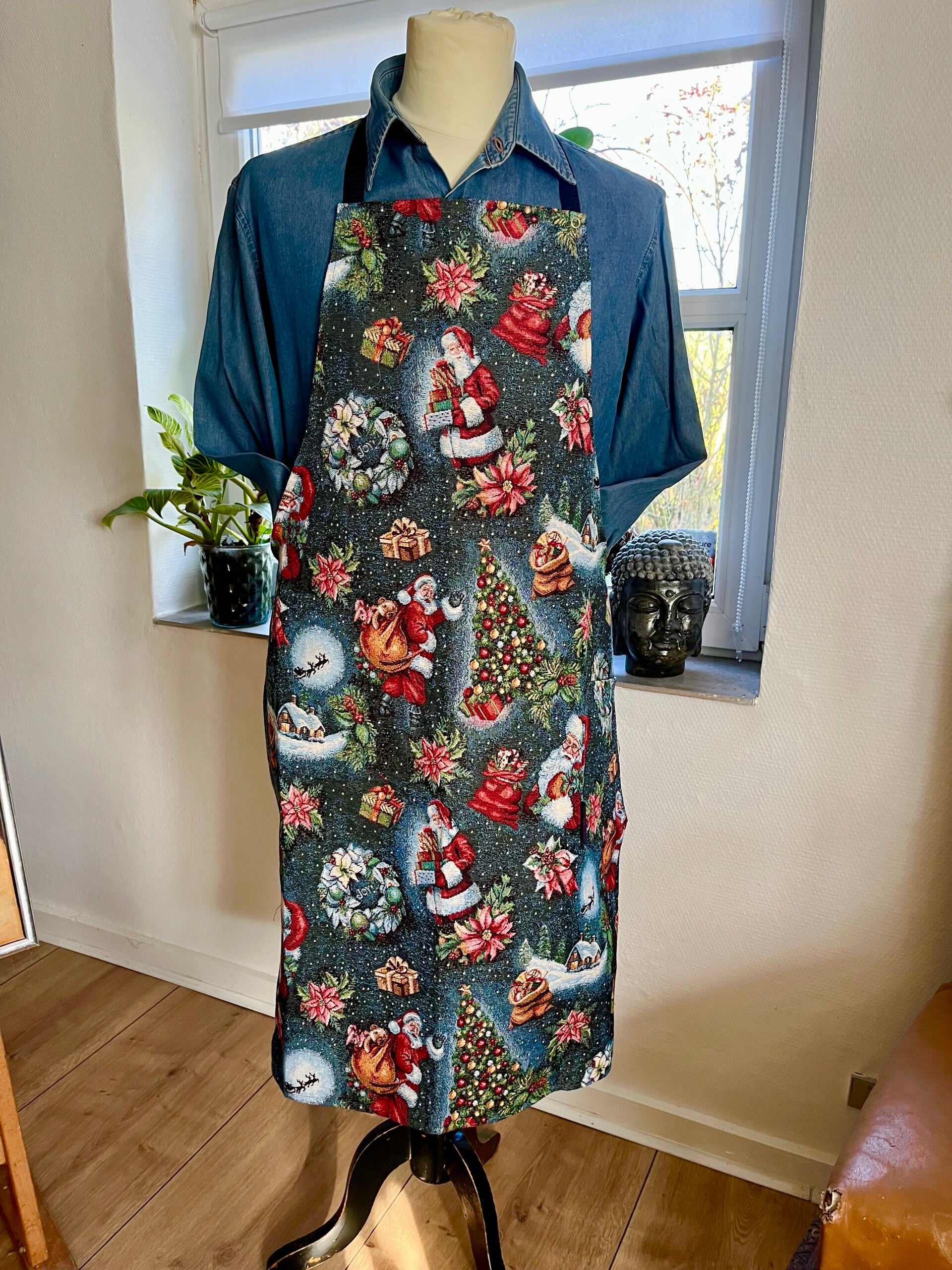 Forklæde i gobelin. Kraftig vævet med påsyet lomme .