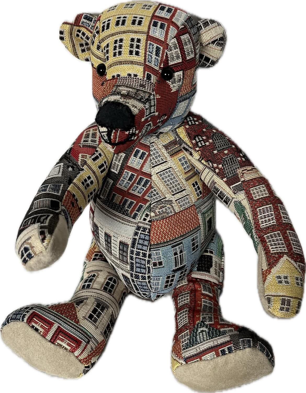 Lavet i kraftig gobelin . Med poly filling , glasøjne og drejelige led.