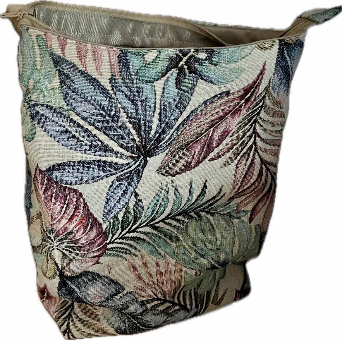 Upcyclet Denim bukse taske. Str 35x25 cm med bred regulerbar rem, påhægtet med karabinhager. Lukkes med lynlås . En lomme indvendig .