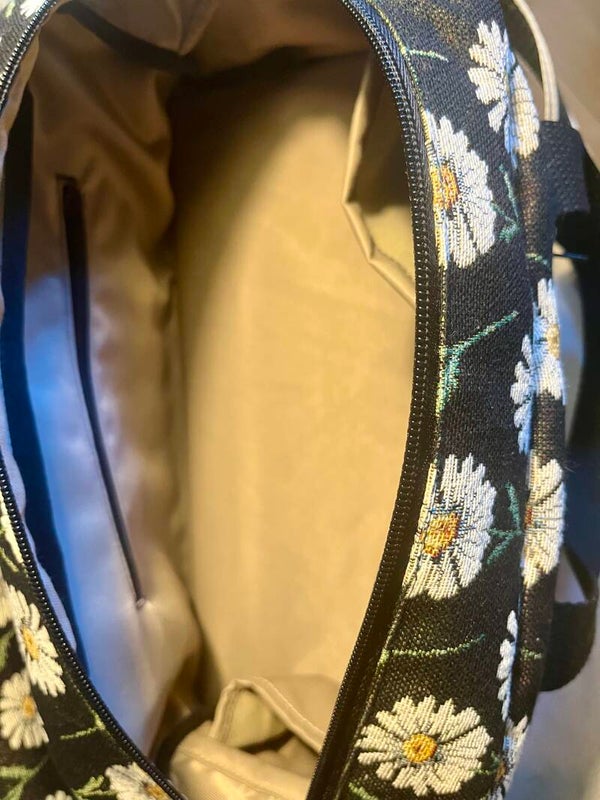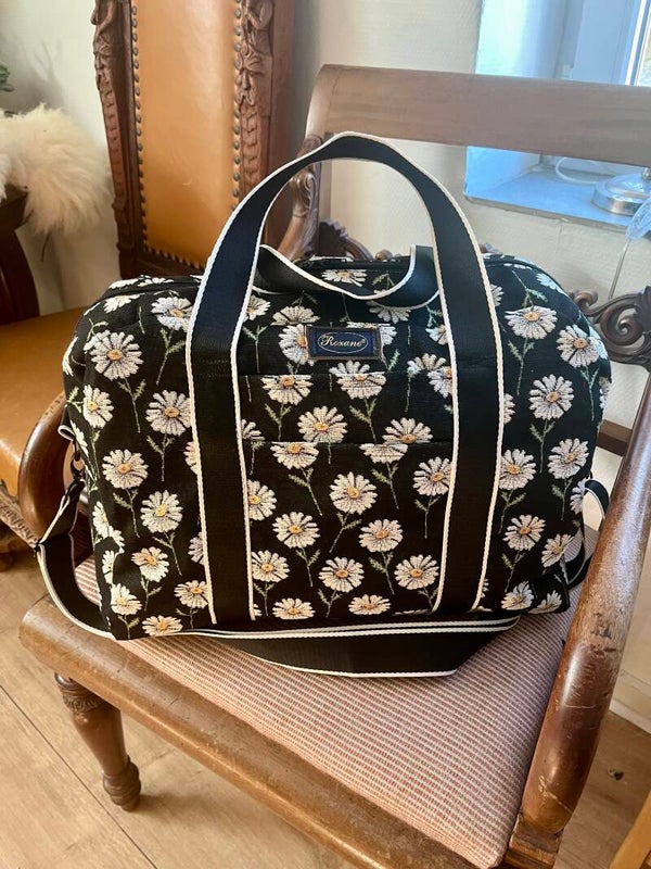 Lækker rummelig rejsetaske i Gobelin , foer i bæver nylon . Udvendig og indvendig Lynlåslomme, og 2 udvendige lommer og flere indvendige lommer.