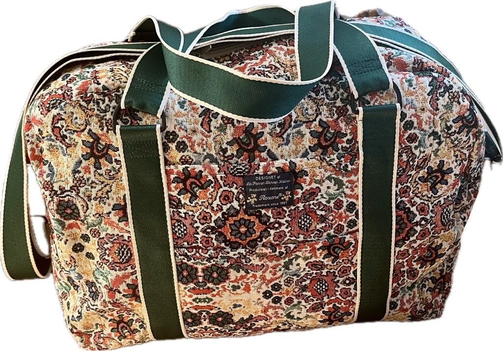 Lækker rummelig rejsetaske i Gobelin , foer i bæver nylon . Udvendig Lynlåslomme, og 2 udvendige lommer og flere indvendige lommer.