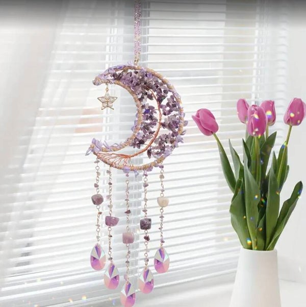 Drømmefanger med 5 arme og halv måne , med krystal glas der sender smukke lys i rummet. Med lilla ametyst natursten .Størrelse 45x15 cm