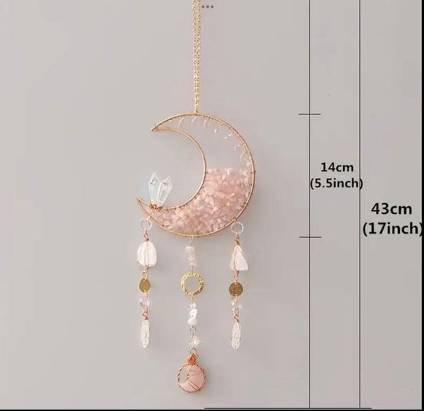 Drømmefanger med 5 arme og halv måne , med krystal glas der sender smukke lys i rummet. Med lyserøde rosa kvarts natursten