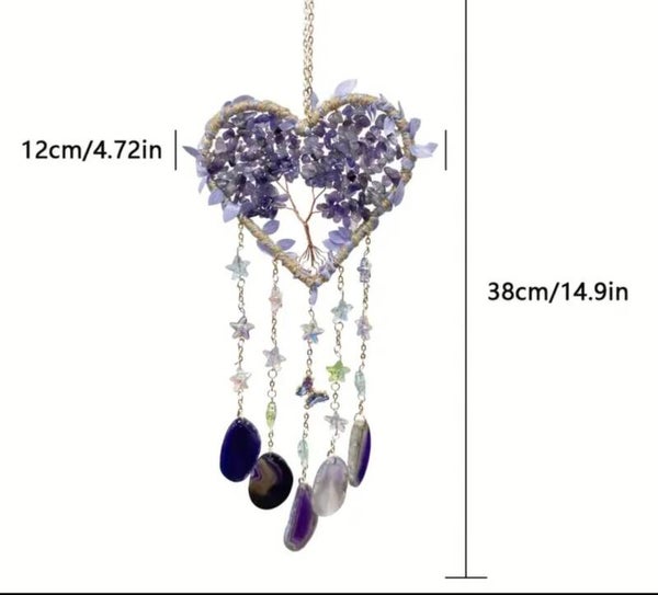 Håndlavet Livets træ i Rose Quartz krystal. med 5 arme med krystal glas og agat skiver. Lavet i kobber. Hjerteform
