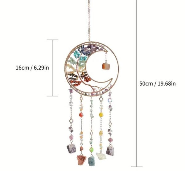 Drømmefanger med 5 arme og halv måne , med krystal glas der sender smukke lys i rummet. Med grønne aventurin, citrin , ametyst lapis lazuli, rød jasper, tyrkiser og tigerøje natur sten .