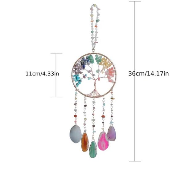 Drømmefanger med 5 arme og med flourit krystaller der sender smukke lys i rummet. Med grønne aventurin, citrin , ametyst lapis lazuli, rød jasper, tyrkiser og tigerøje natur sten .