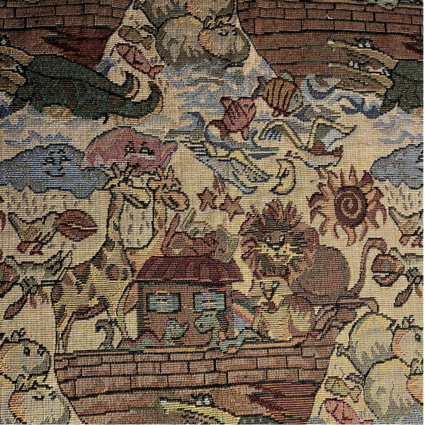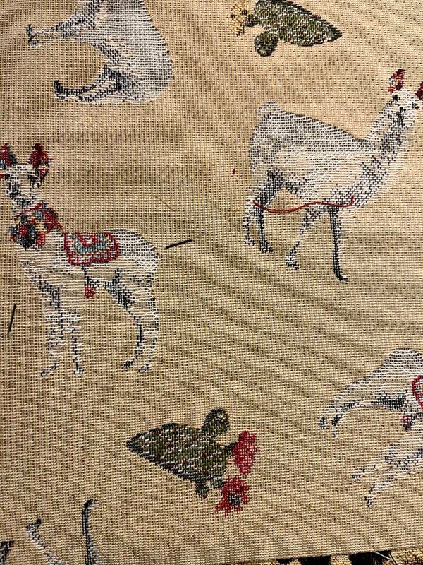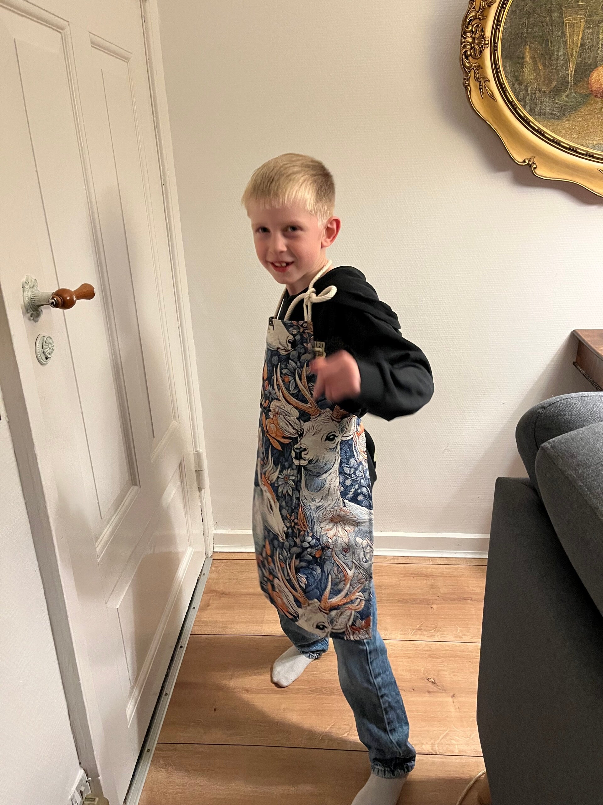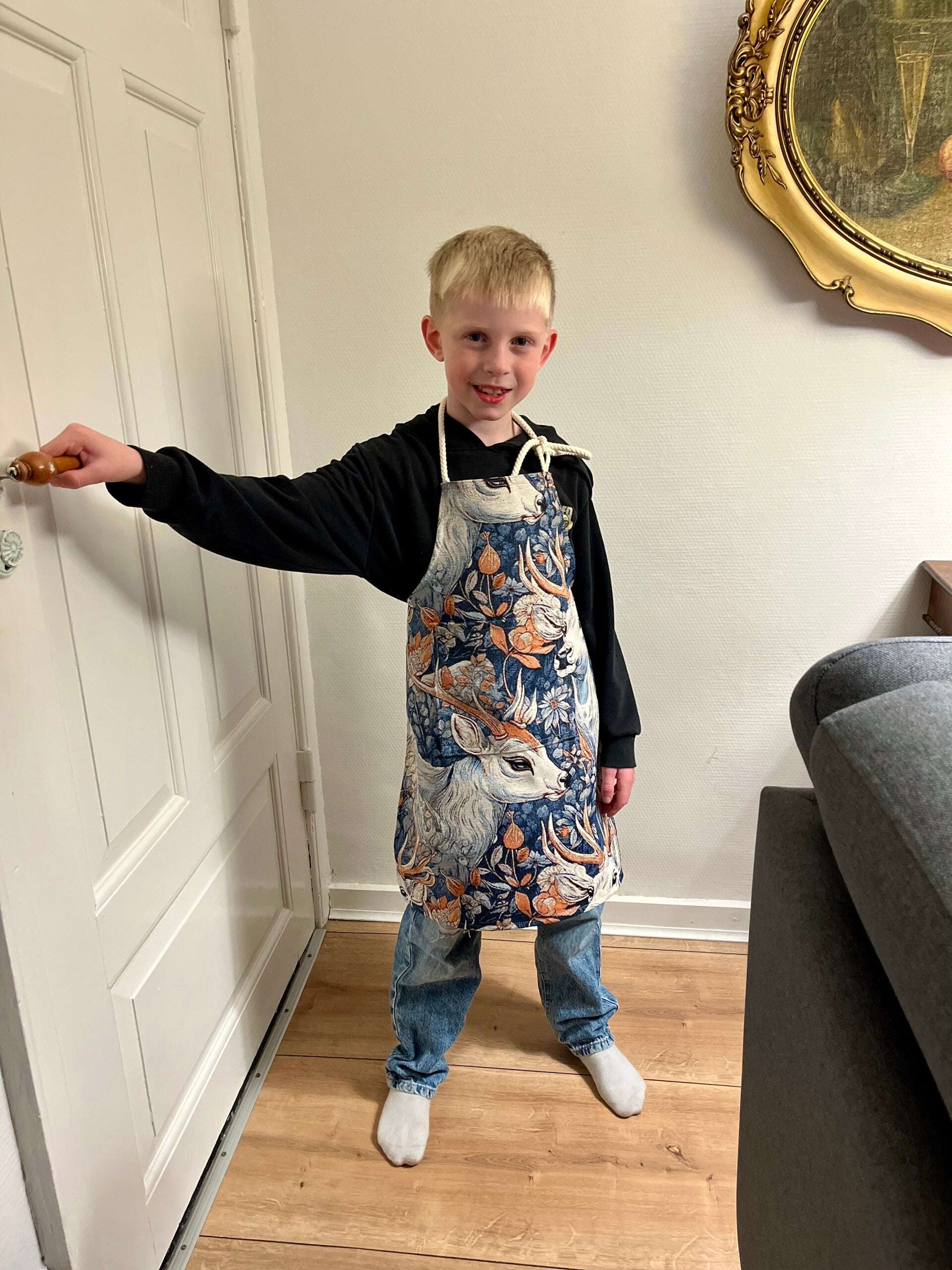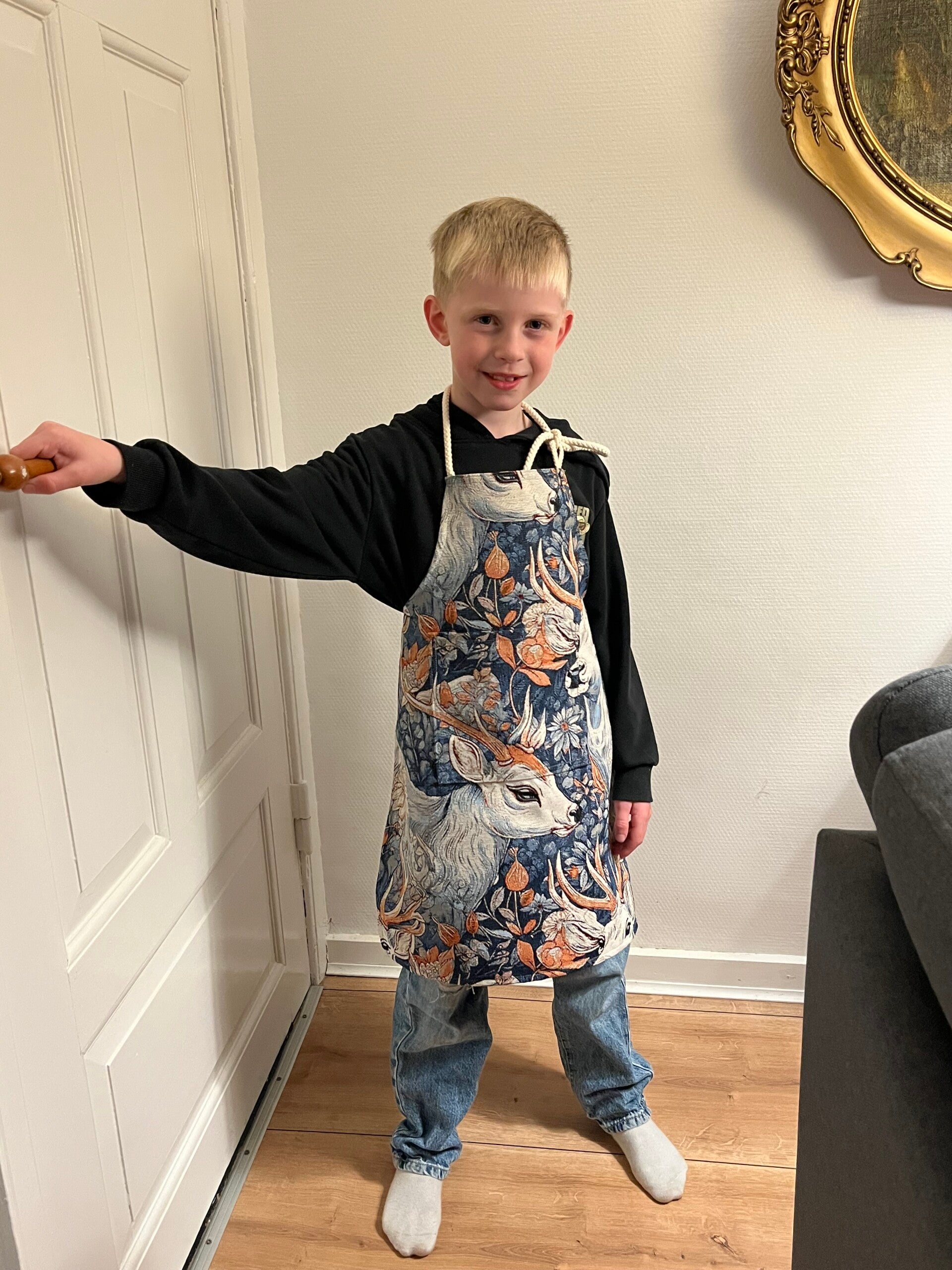 Forklæde til børn i gobelin med lomme, bindebånd og regulerbart .